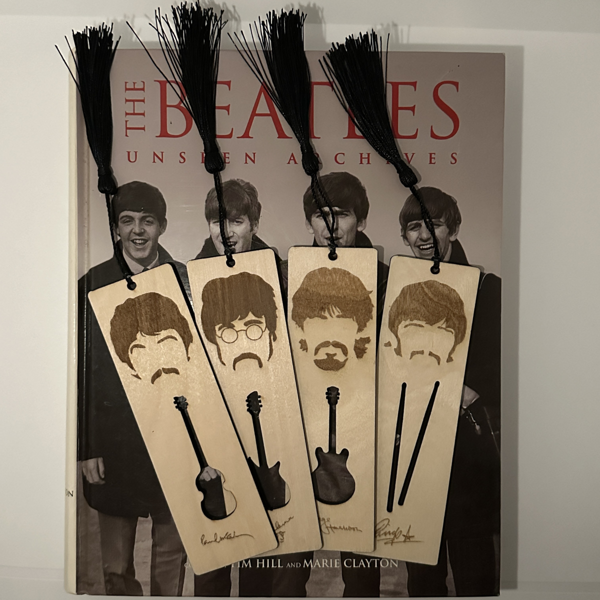 4 Baltic Birch wood bookmarks for the Beatles fan. Makes a great gift for people who love the Fab Four.