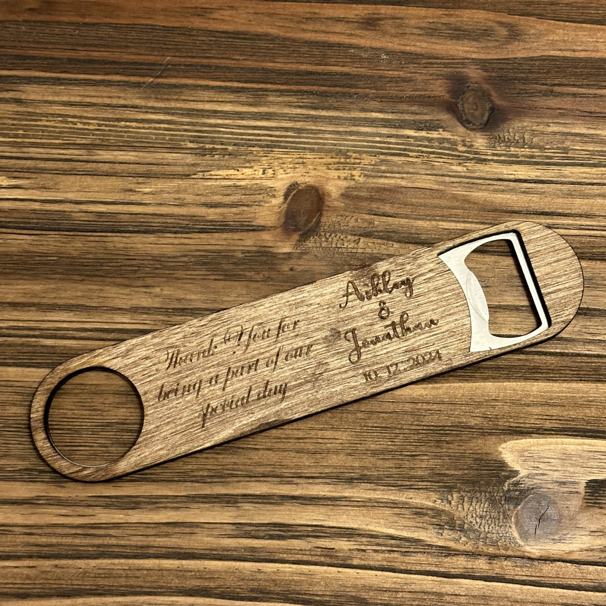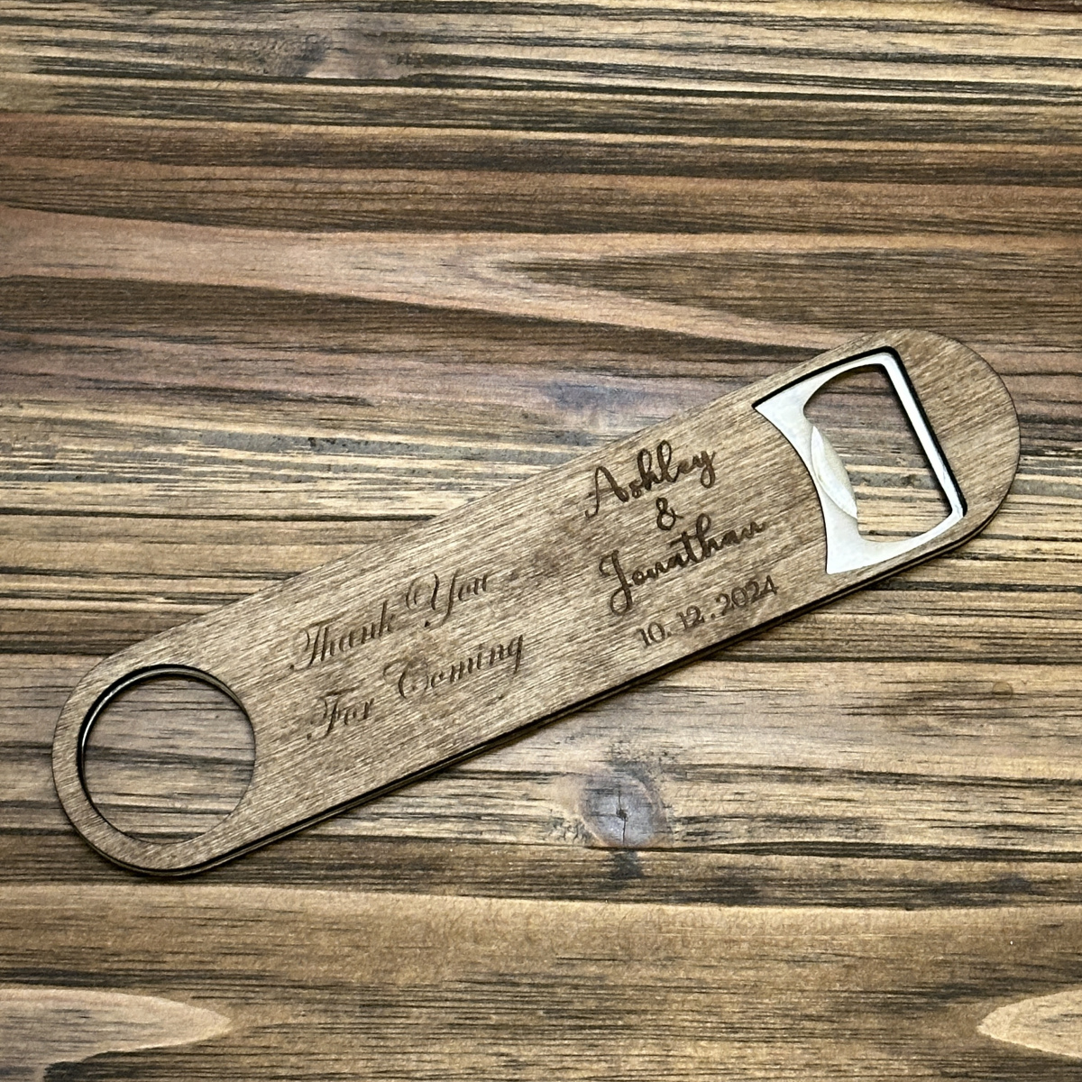 Stainless steel bottle opener between 2 pcs of stained Baltic Birch. Perfect as wedding gifts - engraved with thank you notes to the wedding party and guests of your special day. Custom messages can be created.