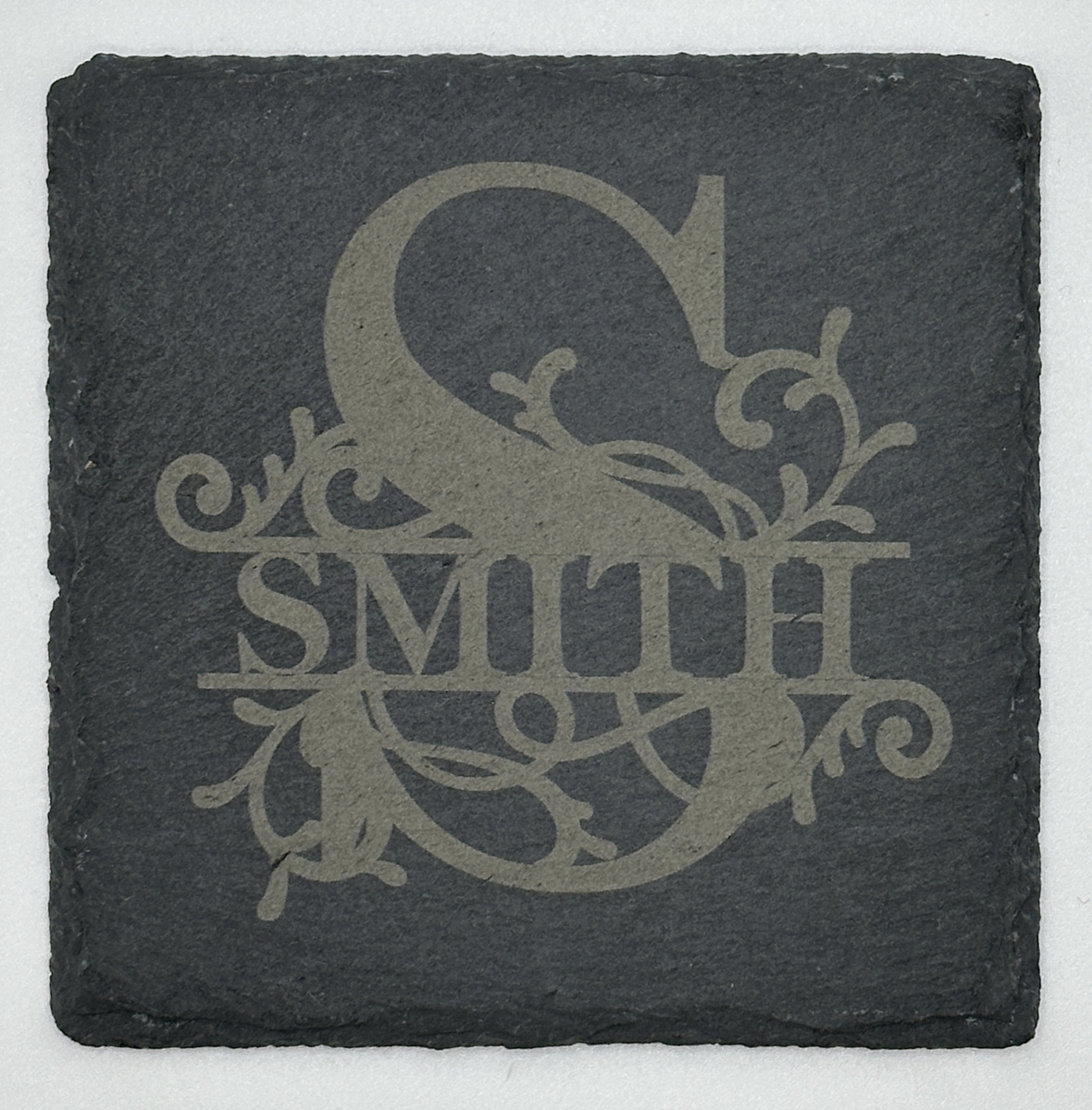 Set of 4 laser engraved monogram slate coasters. Makes a great closing gift.