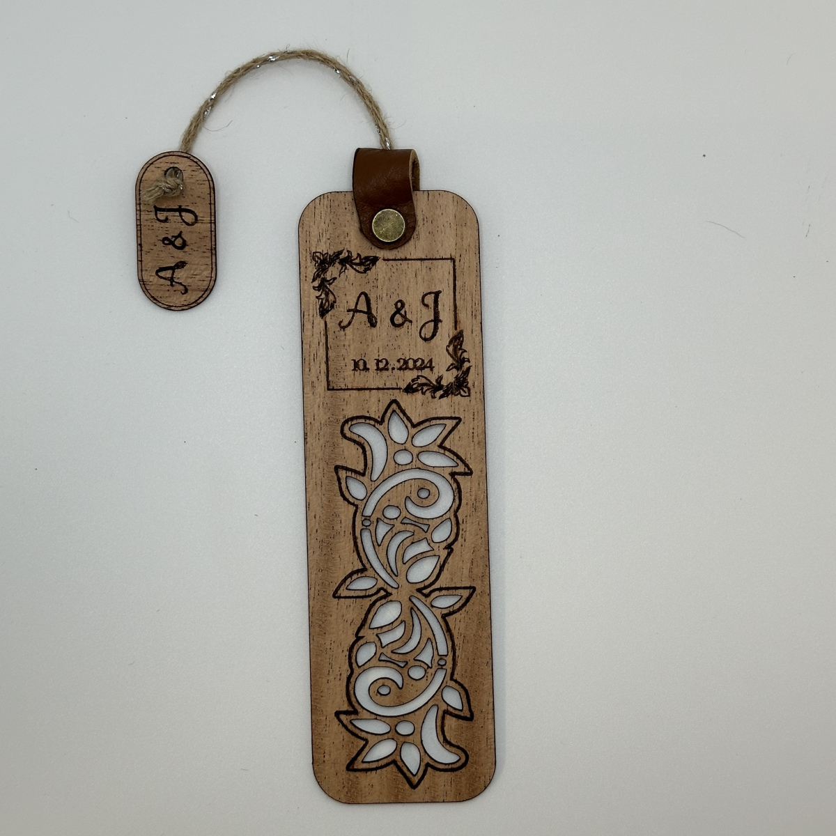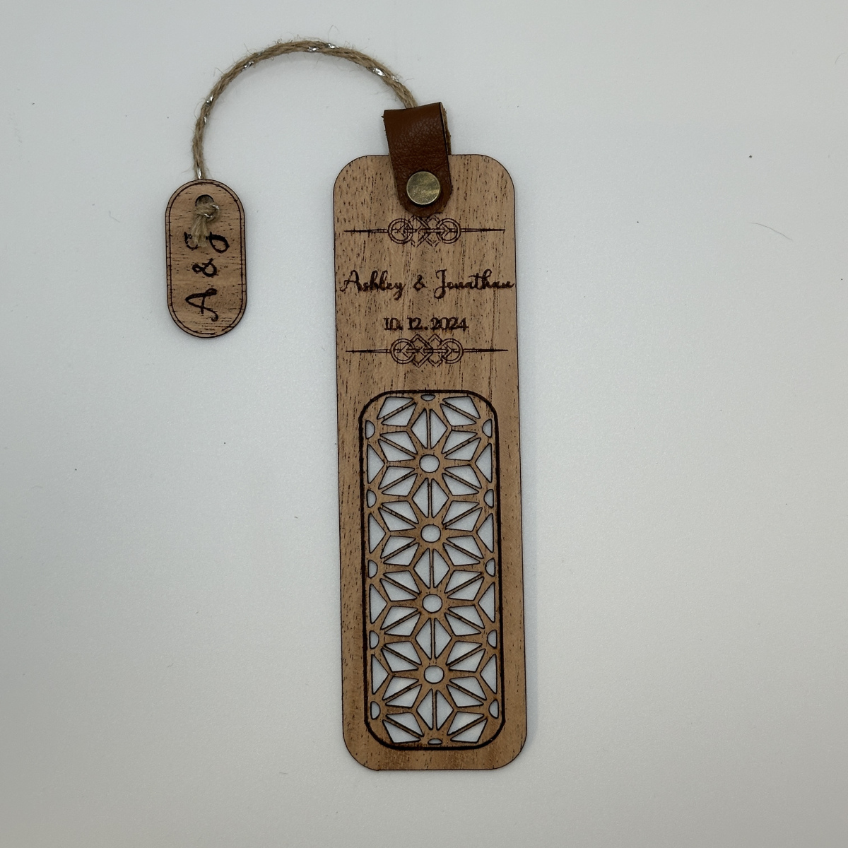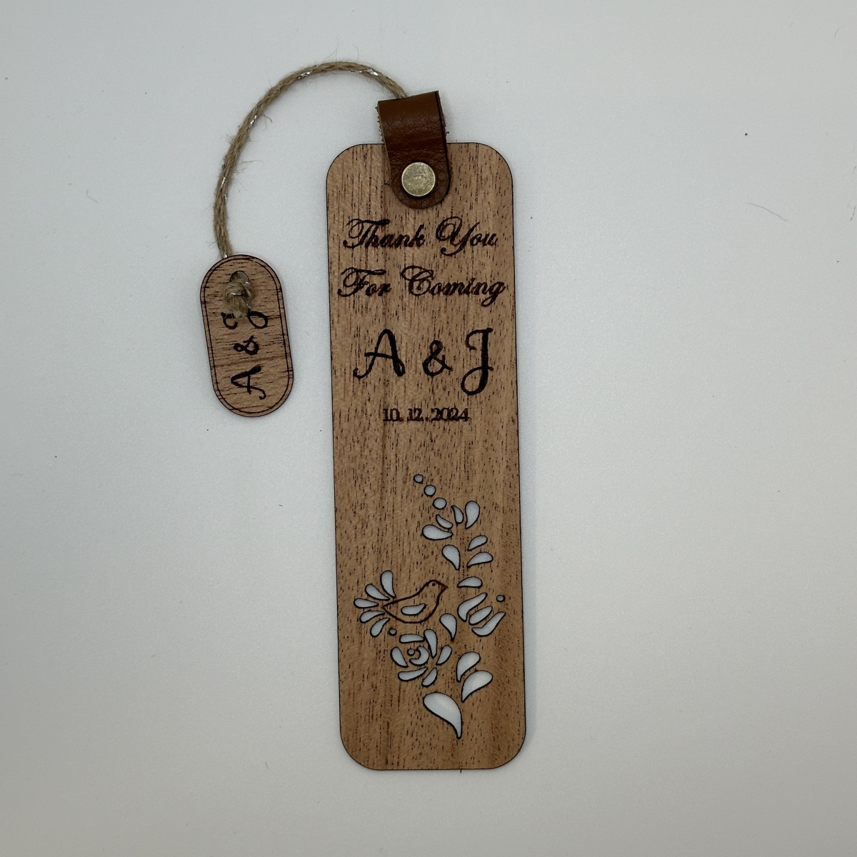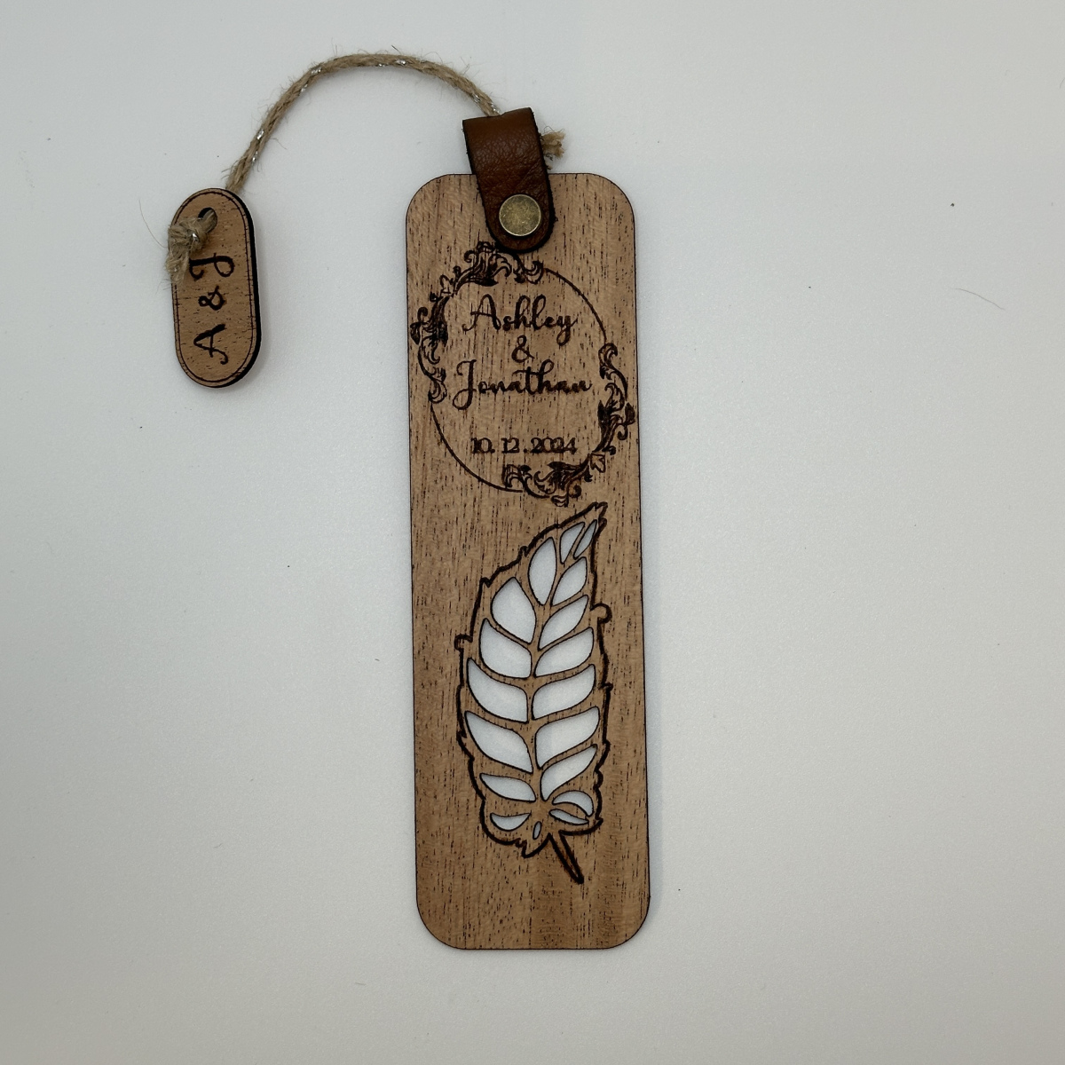 These premium bookmarks make a great gift for wedding guests! Made from Padauk wood with a leather strap.