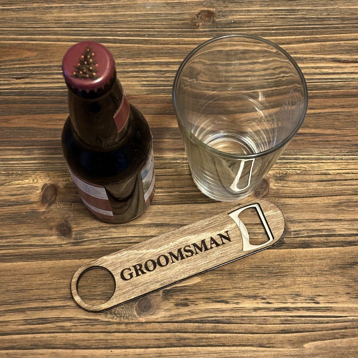 Stainless steel bottle opener between 2 pcs of stained Baltic Birch. Perfect as wedding gifts - engraved with Best Man or Groomsman.